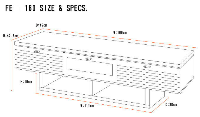本体サイズ幅1600mm × 奥行455mm × 高さ425mm中央扉幅490mm × 奥行410mm × 高さ175.5mm下段幅500mm × 奥行370mm × 高さ99.5mm左右引出幅450mm × 奥行340mm × 高さ120.5mm仕様前面(アルダー無垢材本体(含浸紙)4mm並ガラス 3段引きスライドレール引出し耐荷重天板静止耐荷重 およそ80kgその他日本製。